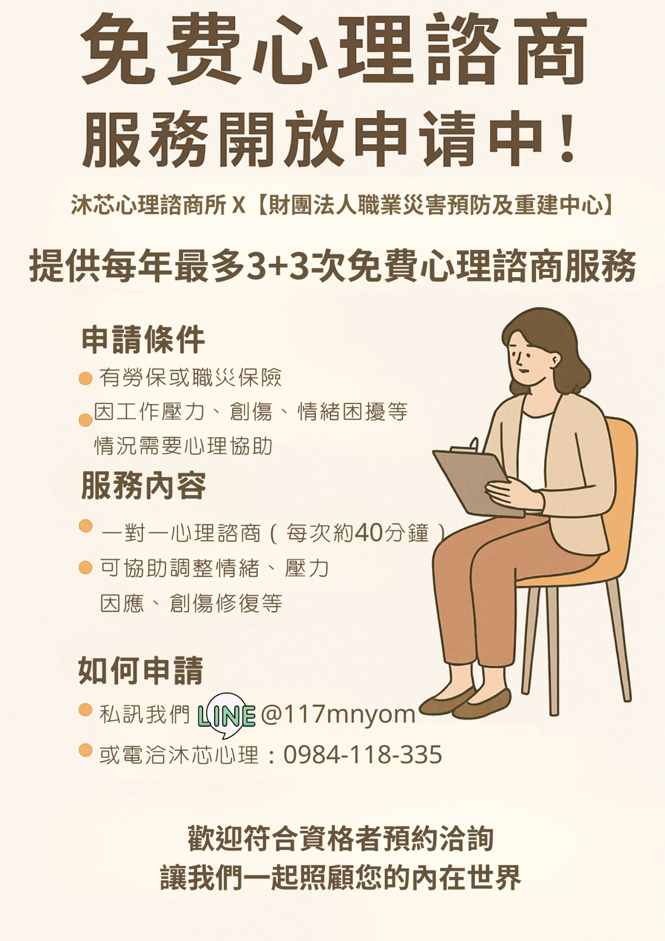 沐芯心理 × 財團法人職業災害預防及重建中心,提供符合資格的朋友,每年最多3+3次免費心理諮商服務。