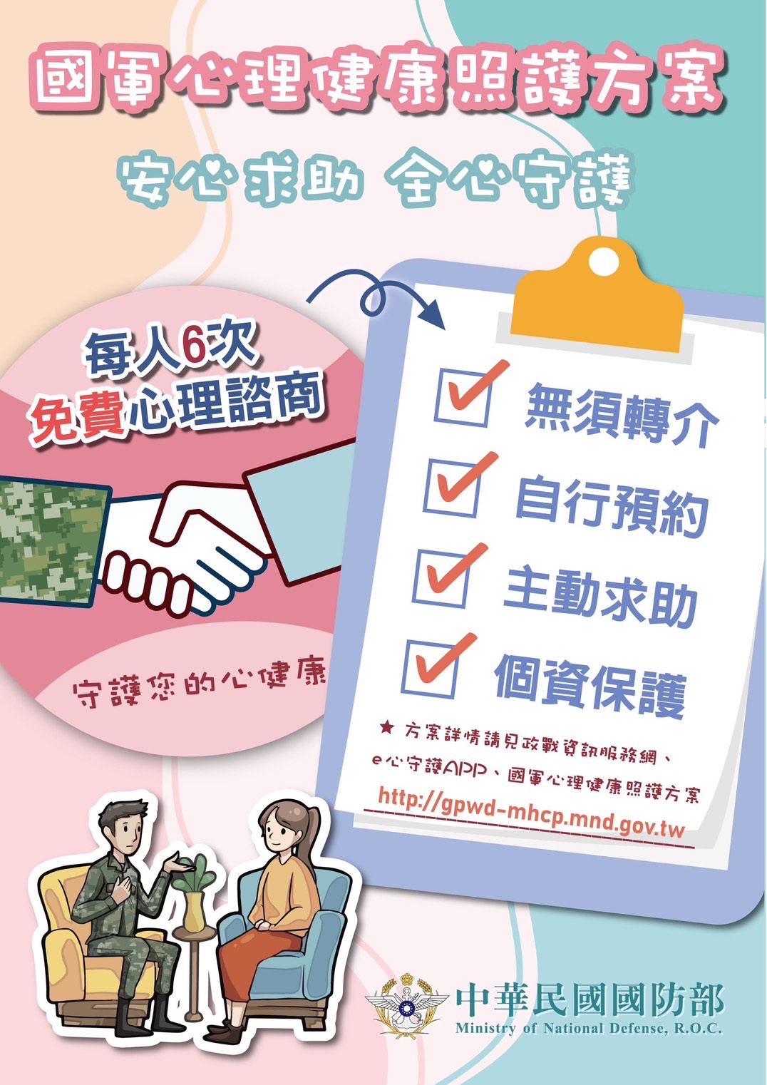 提供現役軍人及相關人員專業、保密的心理諮商服務,
