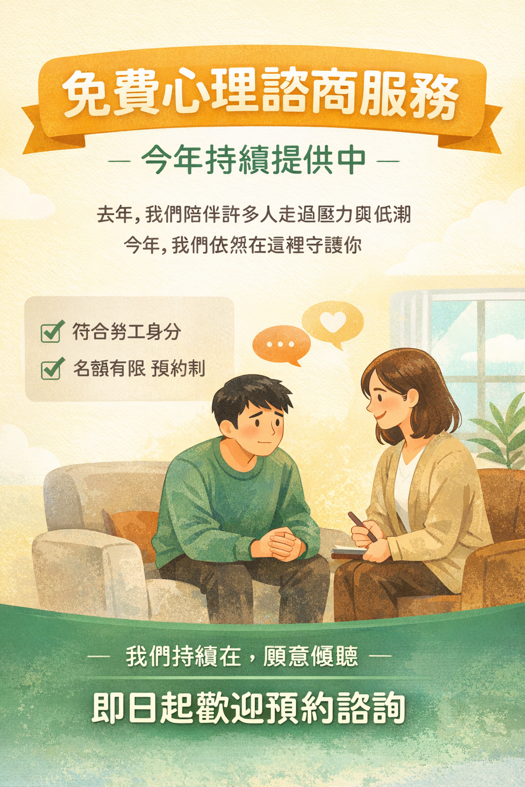 ✔ 內容:每年可享有最多3+3次免費諮商。